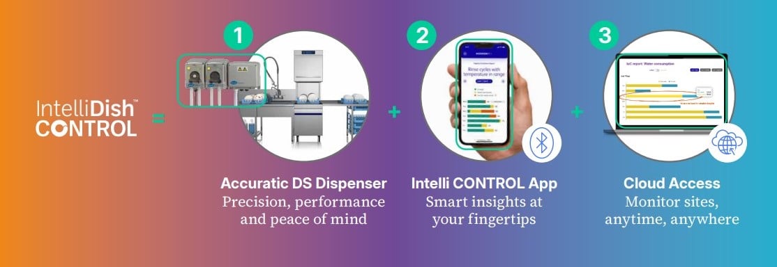 At the core of IntelliDish CONTROL is the Bluetooth enabled Accuratic DS a high-precision, ultra-reliable dosing system that ensures: